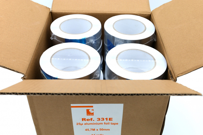 25 mikronska splošno uporabna aluminijasta folija prevlečena z akrilnim lepilom in podloge iz silikoniziranega papirja.